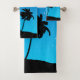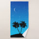 Handtuch-Set in einer schwarzen Silhouette von Palmen auf einer tropischen Insel, gegen einen Abend blauen Farbverlauf mit Sternen und Halbmond