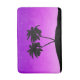 Badematte in einer Silhouette von Palmen auf einer tropischen Insel, gegen ein violettes bis tiefes lila Dämmerungsgefälle mit Sternen