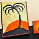 Das auf dem Sockel gedruckte Bild ist ein Foto eines originalen Wandgemäldes aus Wandteppichen, handgefertigt und urheberrechtlich geschützt durch den publizierten Designer Delores Chamblin. Auf dem Plastikständer wird die Silhouette der handgefertigten Palmen und die helle Orangensonne wiedergegeben. Die Farbe ist ein digitaler Filter.