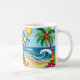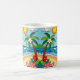 A coastal Coffee Mug in a paper quilling style ai illustration of two palm trees, the sun, ocean waves, a beach and tropical flowers.