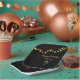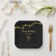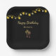 Das Tropical Beach Birthday Party-Papier Platte mit eleganten Palmen Saitenleuchten Design auf einem schwarzen Hintergrund. Mit der anpassbaren Typografie-Schrift fügen Sie Ihre eigenen Informationen hinzu. Eine glamouröse Ergänzung zu Ihrem Strand inspiriert Abendtisch.