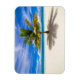 Dieses Foto hat eine Palme, die allein auf einem weißen Sandstrand stehend ist.