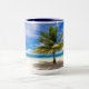 Dieses Foto hat eine Palme, die allein auf einem weißen Sandstrand stehend ist.
