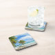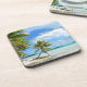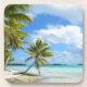 Untersetzer mit einer hängenden Palme auf einem weißen Sandstrand von einer tropischen Insel im pazifischen Ozean, der dem Tahiti-Archipel das französische Polynesien gehört.