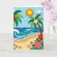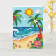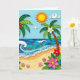 Eine Geburtstagskarte an der Küste in einem Papierquilling-Stil, in einer Illustration von zwei Palmen, der Sonne, den Ozeanwellen, einem Strand und tropischen Blume. Eine coole Geburtstagskarte am Meer für ihn oder sie.