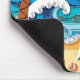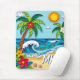 Ein mit Monogramm Mauskissen an der Küste in einem Papierquilling Stil ai Abbildung von zwei Palmen, die Sonne, Ozeanwellen, ein Strand und tropische Blume.