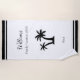 Denken Sie an den tropischen Urlaub Ihrer Familie mit diesem individuellen Strandtuch. Das Handtuch ist modern und hat eine schwarze Silhouette aus Palmen und schwarzem Text mit Familienname, Reisejahr und Reiseziel. Dieses Badetuch am Strand und am Pool ist ein wunderschöner personalisierter Sake, der noch für viele Jahre geschätzt wird.