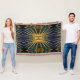 Das originelle Sonnenburstdesign von ZoeSPEAK auf diesem Throw Blanket entstand aus Zoes Originalfoto von Sägepalmenfronten. Die grün-gelben Fronten lüften vor einem dunkelgrünlich-blauen Hintergrund und bilden ein Muster, das wie ein Stoff aus Teppichen aussieht.