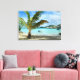 Impression paysagère en toile d'un palmier sur la plage de sable d'une luxueuse station de vacances au toit de chaume surplombant l'eau sur l'île tropicale Bora Bora, près de Tahiti dans l'archipel pacifique Polynésie française. Superbe décoration sur votre mur !