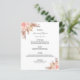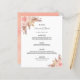 Eine elegante bohemianische Hochzeitskarte. Personalisieren und fügen Sie Ihre Namen, Datum und das Hochzeitsmenü. Ein weißer Hintergrund. Dekoriert mit rosafarbenen Blumen und Pampas-Gras. Zurück: Rose goldfarbener Hintergrund.