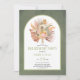 Tropisch getrocknete Blätter aus Palmen, Pampas-Gras und Protea-Blume laden zu einer grünen Bogen-Party ein. Dieses schöne Hochzeitsdesign besticht durch einen Bogenrahmen auf grünem, farbigem Hintergrund. Im Rahmen befindet sich ein Aquarellbouquet mit Blätter aus getrockneten Palmen, Protea-Blume und Pampas-Gras.