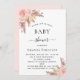 Für eine moderne Babydusche im bohischen Stil. Ein weißer Hintergrund auf der Vorderseite. Die Einrichtung ist mit Rose-Gold und rosa Blumen, Rose, Pampas-Gras dekoriert. Personalisieren und fügen Sie einen Namen und Party-Details hinzu. Zurück: Rose Gold Hintergrund.