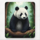 A panda sits on a branch surrounded by lush green foliage. The lighting highlights its distinct black and white fur against the vibrant background.