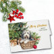 Sur cette carte de vacances, un mignon Collie Dog aux épaules repose dans son lit en osier devant un sapin de Noël décoré. Derrière le panier se trouve un joli bouquet rouge de baies saintes et de cônes de pins. Le texte en or à droite dit "MERRY CHRISTMAS", avec HAPPY NEW YEAR en vert en dessous. Tout le texte, à l'intérieur et à l'extérieur, peut être facilement changé à tout ce que vous voulez. Vous pouvez voir d'autres images de collie, ainsi que d'autres images de races, à Dog Village.