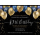 Ballons de parties scintillant en faux bleu et or élégants sur la bordure supérieure. Tout le texte est ajustable et facile à changer pour vos besoins de fête. chaque année, l'âge peut être changé