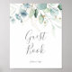 Ce panneau de livre d'or à feuillage aéré et feuille d'or est parfait pour un mariage moderne. Le design botanique élégant présente un eucalyptus aquarelle léger et aéré accentué de feuilles de glitter doré fantaisistes.