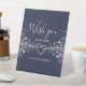 Élégant panneau de table de mariage moderne bleu marine avec cœur de corde argentée et dentelle florale dorée vintage. Nous aurions aimé que vous soyez ici.