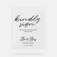 Un simple arrière - plan blanc minimaliste et un texte en script noir "signe gentiment" panneau de table mariage pour encourager votre invité à signer votre livre d'or mariage.