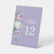 Ce panneau de numéro de table mariage lavande-violet présente des pivoines d'aquarelle blanc et violet, de la lavande, des formes géométriques et de la typographie. Idéal pour un mariage extérieur. Trouvez les articles correspondants dans Lavender Purple Floral Mariage Collection.