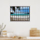 Schöne Imitat Gitterfenster Blick tropischen Strand Ozean Szene, für ein fensterloses Büro. Sehr realistische 3D-Strandwandkunst, optisches Illusionsplakat, das auf einem Büro oder einer Studentenwand gut aussehen würde.