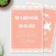 Eine schöne papel picado Stil Hochzeitseinladung auf einem rot-rosa Hintergrund. Auf der Rückseite befindet sich ein Taubendesign mit den Initialen des Paares. Ideal für eine traditionelle oder moderne mexikanische Hochzeit.