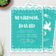 Une belle faire-part de mariage en papel picado sur un arrière - plan turquoise. Le dos est décoré d'un dessin de colombe avec les initiales du couple. Parfait pour un mariage mexicain traditionnel ou moderne.