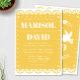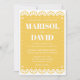 Une belle faire-part de mariage en papel picado sur un arrière - plan jaune festif. Le dos est décoré d'un dessin de colombe avec les initiales du couple. Parfait pour un mariage mexicain traditionnel ou moderne.