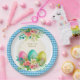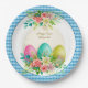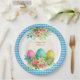 This design features a classic light blue and white checkered border that brings a crisp, fresh look to your spring table. The centerpiece is a stunning watercolor arrangement of intricately patterned Easter eggs—in pink, teal, and lime—surrounded by blooming pink roses and white lilies.
