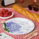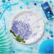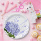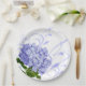 Party-Papier-Teller in der weißen Dinner-Größe mit einem Kunstdruck von einem schönen Single blauen Hydrangea-Design gezeigt. Wir bieten eine Serviette, die zu dieser Papiertafel passt. Passen Sie dieses Objekt an oder kaufen Sie, wie es ist. Bild