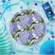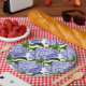 Die Papiertafel aus Party wird in der Abendgröße mit einem Kunstdruck von schönen blauen Hydrangeas gezeigt. Passende Papierservietten sind erhältlich. Passen Sie dieses Objekt an oder kaufen Sie, wie es ist. Bild