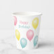 Party Papiertassen mit bunten pastellfarbenen Party Ballons mit den Grüßen, Happy Birthday und den Namen der Person, die geehrt wird.