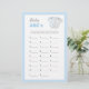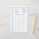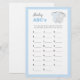 Le jeu Baby ABCs est une activité amusante pour n'importe quel Baby shower, car les invités essaient de remplir les cartes avec des articles bébé qui commencent par chaque lettre de l'alphabet. Cette carte est offerte dans un jeu de couleurs bleues, avec une jolie illustration de costume corporel. L'addition parfaite à toute fête de Baby shower ! Trouver d'autres jeux et objets correspondants sur www.zazzle.com/mypartydesign