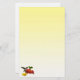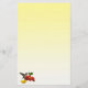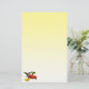 Cette papeterie présente un colibri à gorge rubis féminin. Elle flotte dans l'air en buvant du nectar du centre doré d'une fleur de zinnia rouge vif. Une fleur de zinnia jaune se trouve à proximité et quelques feuilles verts complètent la composition. Les couleurs semblent se détacher de l'arrière - plan dégradé jaune.