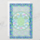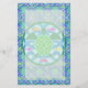 Une tortue de mer verte avec la coquille modelée, contre une eau bleue/motif de vague, avec plusieurs poissons colorés. Conception circulaire avec une frontière verte. Papeterie sans doublure.