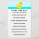 Une activité de jeu de baby shower unique, avec de l'art de canard en caoutchouc mignon, un quiz de rime en pépinière de Mother Goose, et un endroit pour inclure des conseils parentaux.
