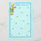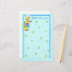 "Une surprise pour le dîner" présente le Chef Dog fixant une surprise, un os enveloppé d'une bougie, prêt à servir. Partagez une recette préférée ou une autre note spéciale. L’expression de Chef Dog montre de la fierté tout en servant la surprise. L'arrière - plan est turquoise avec des empreintes de pattes verts et a une bordure bleue.