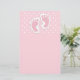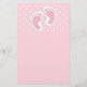 Papier à papier à lettres avec une adorable image d'empreintes de filles roses avec un contour blanc épais. Pois blancs sur un arrière - plan rose derrière l'illustration.