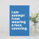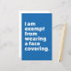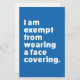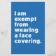 Beaucoup de gens portent des masques et d'autres couvertures pour se protéger contre les infections de COVID-19 et d'autres infections similaires ; dans certaines parties du monde, il y a une obligation légale de les porter dans certaines zones. Cependant, tout le monde ne peut pas porter de masque. Certaines personnes sont exemptées pour des raisons de santé ou autres. Les enfants sont souvent exemptés. Il est également conseillé aux personnes souffrant d'asthme, de difficultés respiratoires, d'anxiété et de nombreuses autres maladies de ne pas porter de masque facial. Ce design a pour but de le rendre clair à tous autour de vous. Le texte dit clairement : "Je suis exempté de porter un couvre-visage".
