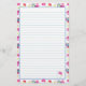 Papier à papeterie aux lignes vives et colorées décoré de petits papillons bleus et de fleurs roses vives peintes en aquarelle sur un arrière - plan blanc immaculé.