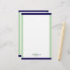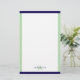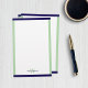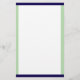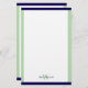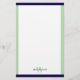 Papeterie personnalisée avec des bordures propres en bleu marine foncé et vert céladon avec votre nom dans le même bleu sur votre initiale dans le même vert pâle. Papier à lettres bleu et vert personnalisé avec votre nom et votre initiale. Papier à lettres monogrammé pour lui avec une bordure en bloc de couleur moderne en bleu foncé et vert clair, imprimé avec son nom et initiale au fond.
