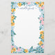 Jolie papeterie florale personnalisée avec votre nom dans un mince script bleu avec des swashes et un cadre de fleurs en rose, jaune et bleu.