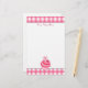 Papeterie comportant une frontière rose de guingan à travers le dessus et le bas. Personnalisez avec votre nom en haut. Illustration d'un petit gâteau de framboise en bas. Personnalisez la lettre sur le haut de forme de petit gâteau avec votre initiale.