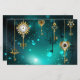 Or, clés antiques avec engrenages et cadrans accrochés sur chaînes dorées sur arrière - plan vert lumineux.