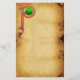 Elégante lettre de l'alphabet rouge celtique, motifs géométriques floraux d'un manuscrit médiéval sur vieux parchemin brun vieilli avec un bijou en pierre shamrock vert 3D par Bulgan Lumini (c)