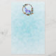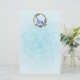 Papier à lettres avec illustration graphique composée d'un loup d'aquarelle violet, dans une posture classique de hurlement. Entourée d'une couronne illustrée de bois, cristaux, plumes et perles. Motif américain cool avec un style boho.