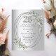 Un arrière - plan faux argenté. Un cadre argenté ovale orné de vert sage. Personnalisez et ajoutez vos noms, détails. Texte noir. 1 feuille = 1 invite imprimé bord à bord.
