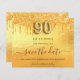 Une petite fille et tendance Enregistrer la carte Date pour une fête de 90e anniversaire. Un arrière - plan moderne à l'allure métallique faux or décoré avec des gouttes de parties scintillant, la peinture goutte à goutte. Personnalisez et ajoutez une date et un nom. Le texte : Save the Date est écrit avec un grand script de style à la main tendance. Numéro 90 avec une police de style ballon.