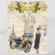 Ce design papier scrapbook présente un collage de la Tour Eiffel de Paris, du Pont de Londres, une voiture fleurie, ancienne et une jolie dame sur des notes de musique arrière - plan.