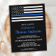Ligne Bleue Mince Invitations de retraite de la police. Célébrez des années de service dévoué, des amis et de la famille invitations à votre parti de retraite d'application de la loi avec cette Invitation à la retraite de la police de la Ligne Bleue mince. Etats-Unis Drapeau américain dans les couleurs Police Drapeau, moderne design noir blanc et bleu tendance. Cette invitation à la retraite des policiers est également parfaite pour les invitations à l'obtention d'un diplôme d'académie de police, lieu de changement dans la personnalisation. Ces cartes postales d'invitation à la retraite doivent être postées comme des cartes postales surdimensionnées, de sorte qu'elles peuvent encourir des frais d'affranchissement standard, mais elles n'ont pas besoin d'une enveloppe ou d'une étiquette d'adresse de retour. Consultez notre collection pour les cadeaux de retraite de la police, les faveurs de la retraite de la police, et les fournitures. DROIT D'AUTEUR © 2021 Judy Burrows, Black Dog Art - Tous droits réservés. Agent de retraite de la police budgétaire Ligne bleue mince