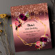 Sur le devant : Une invitation pour une fête d'anniversaire de 50e (ou tout âge). Un arrière - plan de dégradé bordeaux avec un cadre géométrique en faux or. Décoré de fleurs violettes foncées et bordeaux, de plumes roses et boho. Faux parties scintillant en bronze goutte à goutte. Modèles pour un nom et les détails de la fête. Le nom est écrit avec un script de style écrit à la main, des lettres de couleur noire. 1 feuille = 1 invite imprimé bord à bord.